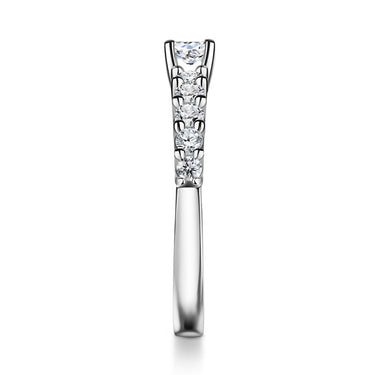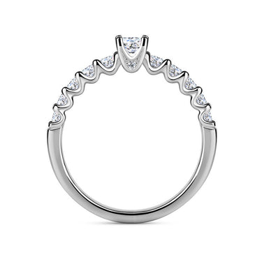 Zásnubný prsteň je vyrobený z bieleho 14 karátového zlata so stredovým diamantom okrúhleho brusu o váhe 0.180 ct. Z každej strany korunky je vsadený jeden malý briliant ako originálny na prvý pohľad ukrytý detail. V masívnejšie obruči je vsadené ďalších 10 diamantov okrúhleho brusu, celková hmotnosť kameňov v šperku je 0.634 ct. Šperk je uložený v luxusnej darčekovej krabičke spolu s certifikátom pravosti.