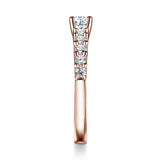 Zásnubný prsteň je vyrobený z ružového 14 karátového zlata so stredovým diamantom okrúhleho brusu o váhe 0,25 ct. Z každej strany korunky je vsadený jeden malý briliant ako originálny na prvý pohľad ukrytý detail. V masívnejšie obruči je vsadené ďalších 10 diamantov okrúhleho brusu, celková hmotnosť kameňov v šperku je 0,712ct. Šperk je uložený v luxusnej darčekovej krabičke spolu s certifikátom pravosti.