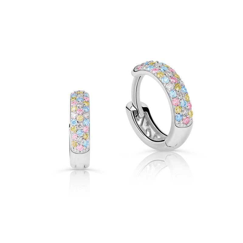Elegantní a hravé kruhové náušnice ze 14 karátového bílého zlata spojují jemnou ženskost s výrazným třpytem. Šperk je zdoben 68 kameny - diamanty SI1, barvy G a excelentním brusu, Mandarin Garnet, Topaz Ice Blue a Sapphire Pink kulatého brusu o celkové váze 0.34 ct, které dodávají náušnicím barevnou jiskru a luxusní charakter. Lesklý povrch a precizní zpracování podtrhují elegantní kruhový tvar a činí z těchto náušnic ideální doplněk pro každodenní nošení i slavnostní příležitosti. Uloženy v luxusní dárkové krabičce a doplněny certifikátem pravosti jsou perfektní volbou pro ženy, které chtějí vyniknout jemným, barevným a sofistikovaným stylem.