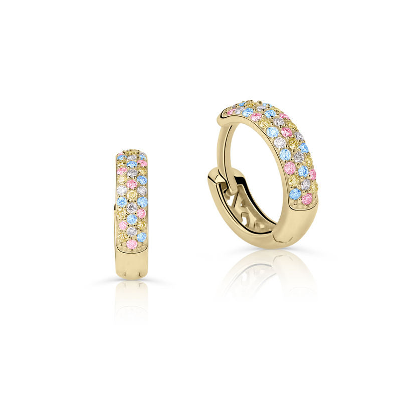 Elegantní a hravé kruhové náušnice ze 14 karátového žlutého zlata spojují jemnou ženskost s výrazným třpytem. Šperk je zdoben 68 kameny - diamanty SI1, barvy G a excelentním brusu, Mandarin Garnet, Topaz Ice Blue a Sapphire Pink kulatého brusu o celkové váze 0.34 ct, které dodávají náušnicím barevnou jiskru a luxusní charakter. Lesklý povrch a precizní zpracování podtrhují elegantní kruhový tvar a činí z těchto náušnic ideální doplněk pro každodenní nošení i slavnostní příležitosti. Uloženy v luxusní dárkové krabičce a doplněny certifikátem pravosti jsou perfektní volbou pro ženy, které chtějí vyniknout jemným, barevným a sofistikovaným stylem.