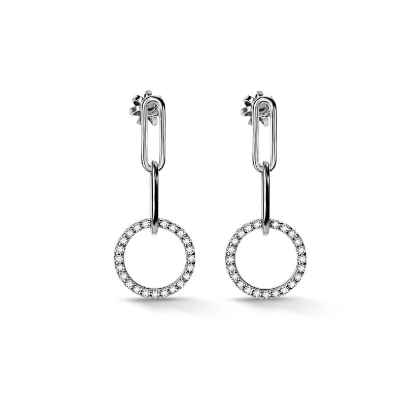 Elegantní a sofistikované visací náušnice ze 14 karátového bílého zlata zaujmou jemným a nadčasovým designem. Šperk je zdoben 48 diamanty kvality SI1, barvy G a excelentního brusu o celkové váze 0.192 ct, které dodávají náušnicím třpyt a luxusní charakter. Praktické zapínání typu balónek zajišťuje pohodlné a bezpečné nošení, zatímco lesklý povrch a precizní zpracování podtrhují elegantní a lehký vzhled šperku. Uloženy v luxusní dárkové krabičce a doplněny certifikátem pravosti jsou ideální volbou pro ženy, které chtějí vyniknout jemným, nadčasovým a sofistikovaným stylem.