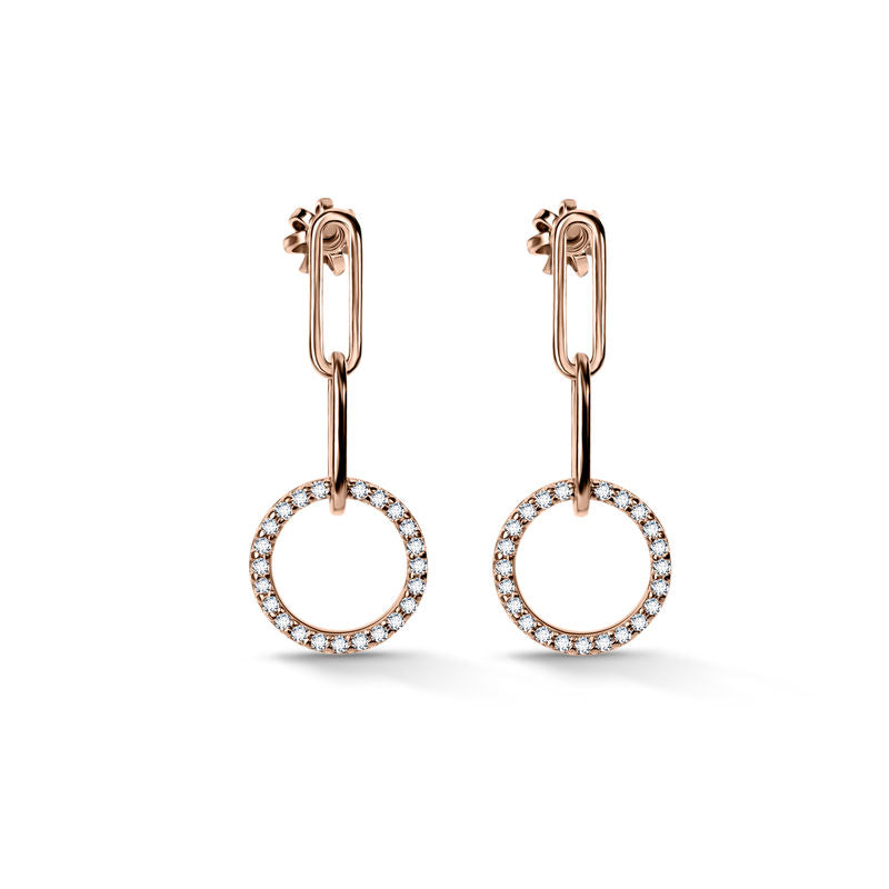 Elegantní a sofistikované visací náušnice ze 14 karátového růžového zlata zaujmou jemným a nadčasovým designem. Šperk je zdoben 48 diamanty kvality SI1, barvy G a excelentního brusu o celkové váze 0.192 ct, které dodávají náušnicím třpyt a luxusní charakter. Praktické zapínání typu balónek zajišťuje pohodlné a bezpečné nošení, zatímco lesklý povrch a precizní zpracování podtrhují elegantní a lehký vzhled šperku. Uloženy v luxusní dárkové krabičce a doplněny certifikátem pravosti jsou ideální volbou pro ženy, které chtějí vyniknout jemným, nadčasovým a sofistikovaným stylem.