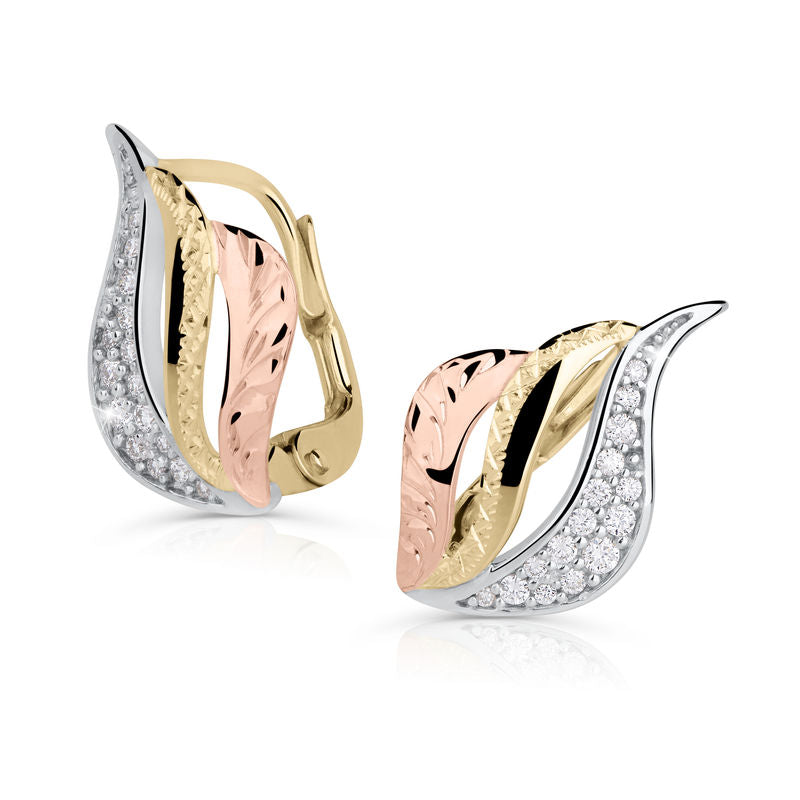 Dámske náušnice Danfil Heritage s detailným ručným gravírovaním s briliantmi v kombinácii žltého, bieleho a ružového zlata 585/1000 s lesklým povrchom a zapínaním na klapku.