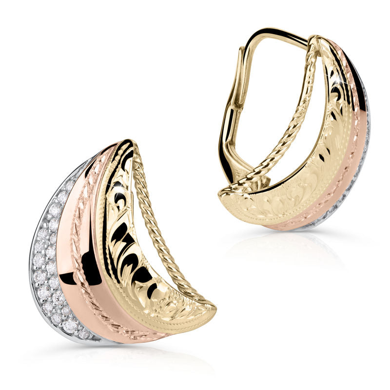 Dámske náušnice Danfil Heritage s detailným ručným gravírovaním s briliantmi v kombinácii žltého, bieleho a ružového zlata 585/1000 s lesklým povrchom a zapínaním na klapku.