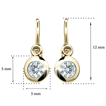 Detské náušničky v tvare klasik so zapínaním typu brizúra sú vyrobené z žltého 14k zlata a osadené svetlo zelenými zirkónmi. Zlaté náušnice majú puncovú značku 585/1000 od štátneho puncového úradu. Tento typ zapínania považujeme za jeden z najbezpečnejších a je najvhodnejší ako prvé náušničky pre bábätko. Všetky rozmery sú podrobne rozkreslené na podpornej fotografii. Ku každým náušničkám je možné vybrať si aj ladiaci prívesok s retiazkou.