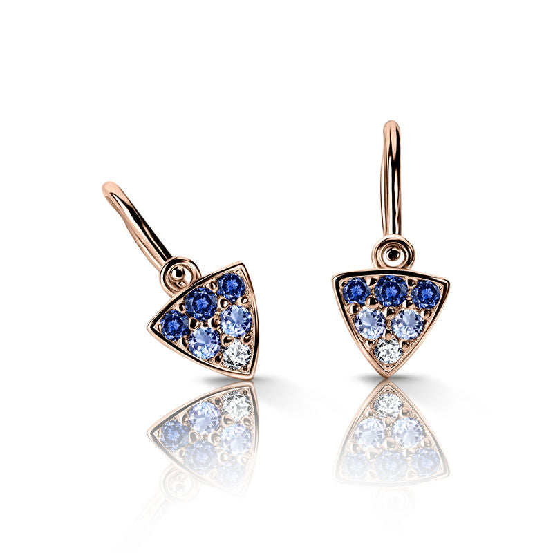 Detské náušnice Danfil C2207 v ružovom zlate s tmavomodrými, svetlomodrými a bielymi kamienkami, brizúrové zapínanie