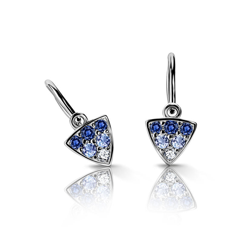 Detské náušnice Danfil C2207 z bieleho zlata s tmavomodrými, svetlomodrými a bielymi kamienkami, mosadzné zapínanie