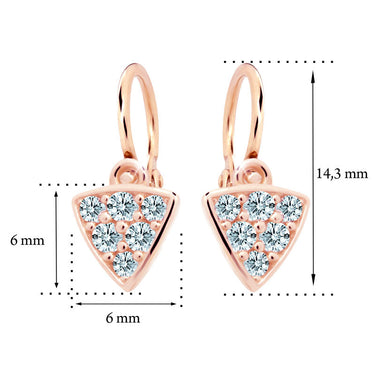 Detské náušnice v tvare klasiky so zapínaním na puzetu sú vyrobené z ružového 14-karátového zlata a posiate dúhovými kamienkami. Zlaté náušnice sú označené puncovou značkou 585/1000 štátneho puncového úradu. Tento typ zapínania považujeme za jeden z najbezpečnejších a je najvhodnejší ako prvé detské náušnice. Všetky rozmery sú podrobne uvedené na spodnej fotografii. Ku každej náušnici si môžete vybrať vhodný prívesok na retiazku.