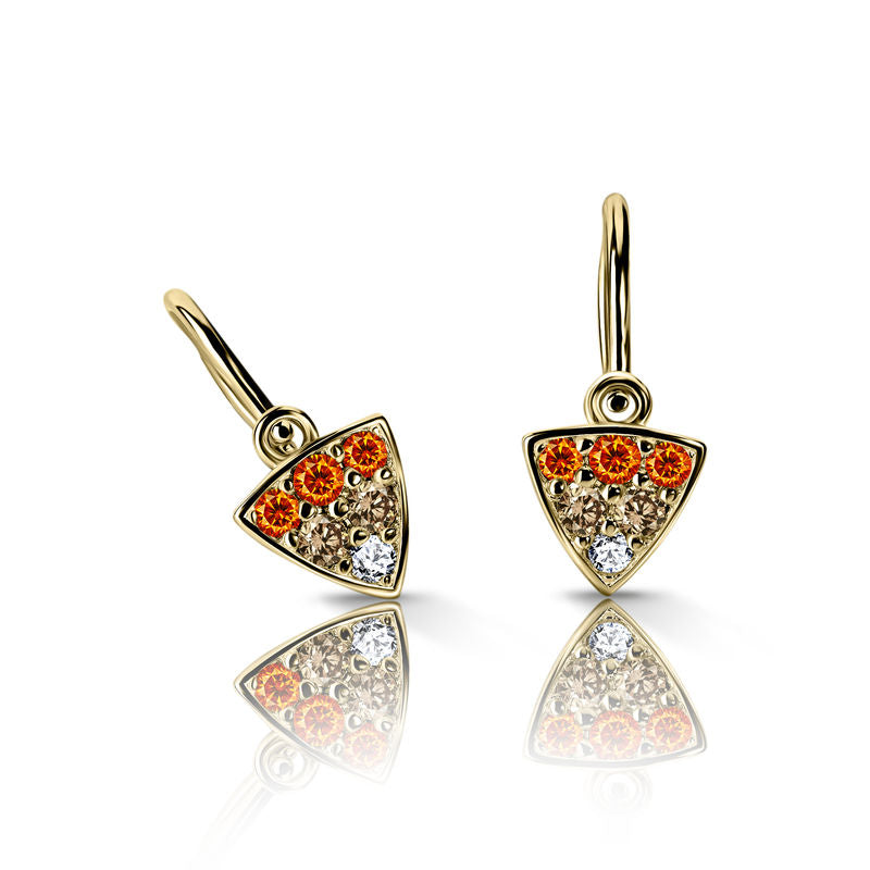 Detské náušnice Danfil C2207 zo žltého zlata s oranžovými, peridotovo zelenými a bielymi kamienkami, brizúrové zapínanie