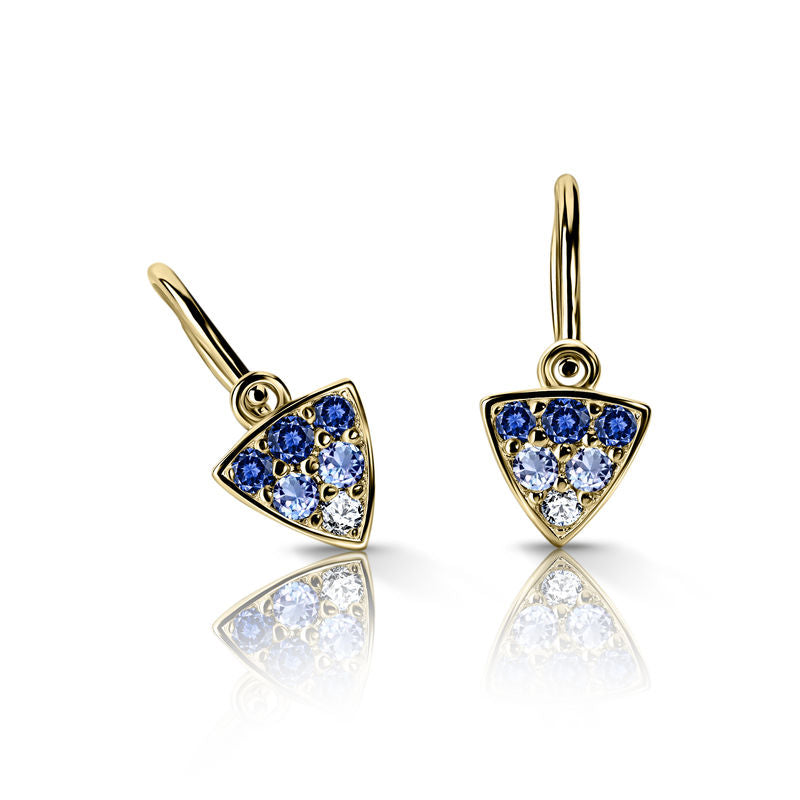 Detské náušnice Danfil C2207 zo žltého zlata s tmavomodrými, svetlomodrými a bielymi kameňmi, brizúrové zapínanie