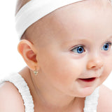 Detské náušničky v tvare klasik so zapínaním typu klapka sú vyrobené z žltého 14k zlata a osadené bielymi kamienkami. Zlaté náušnice majú puncovú značku 585/1000 od štátneho puncového úradu. Tento typ zapínania považujeme za jeden z najbezpečnejších a je najvhodnejší pre malé slečny vo veku od cca 5 rokov. Na tento typ zapínania je možné za príplatok umiestniť bezpečnosťou poistky. Všetky rozmery sú podrobne rozkreslené na podpornej fotografii. Ku každým náušničkám je možné vybrať si aj ladiaci prívesok s retiazkou.