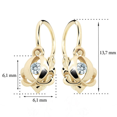 Detské náušničky v tvare klasik so zapínaním typu brizúra sú vyrobené z žltého 14k zlata a osadené tmavo zelenými zirkónmi. Zlaté náušnice majú puncovú značku 585/1000 od štátneho puncového úradu. Tento typ zapínania považujeme za jeden z najbezpečnejších a je najvhodnejší ako prvé náušničky pre bábätko. Všetky rozmery sú podrobne rozkreslené na podpornej fotografii. Ku každým náušničkám je možné vybrať si aj ladiaci prívesok s retiazkou.