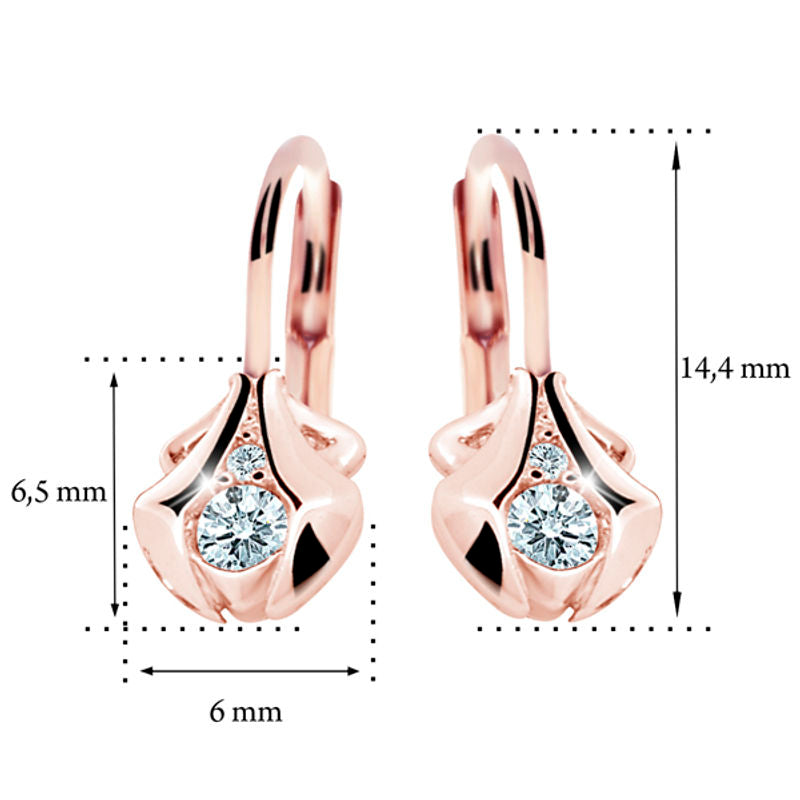 Detské náušničky v tvare klasik so zapínaním typu klapka sú vyrobené z ružového 14k zlata a osadené bielymi zirkónmi. Zlaté náušnice majú puncovú značku 585/1000 od štátneho puncového úradu. Tento typ zapínania považujeme za jeden z najbezpečnejších a je najvhodnejší pre malé slečny vo veku od cca 5 rokov. Na tento typ zapínania je možné za príplatok umiestniť bezpečnosťou poistky. Všetky rozmery sú podrobne rozkreslené na podpornej fotografii. Ku každým náušničkám je možné vybrať si aj ladiaci prívesok s retiazkou.