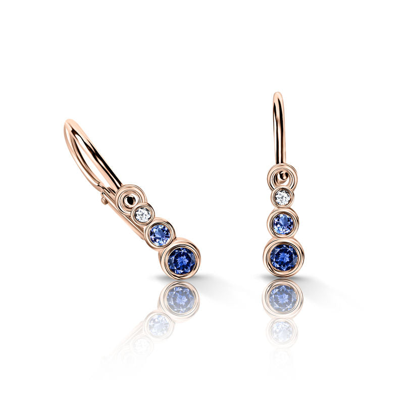 Detské náušnice Danfil C2255 v ružovom zlate s tmavomodrými, svetlomodrými a bielymi kamienkami, mosadzné zapínanie