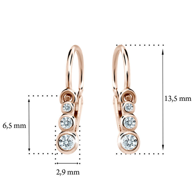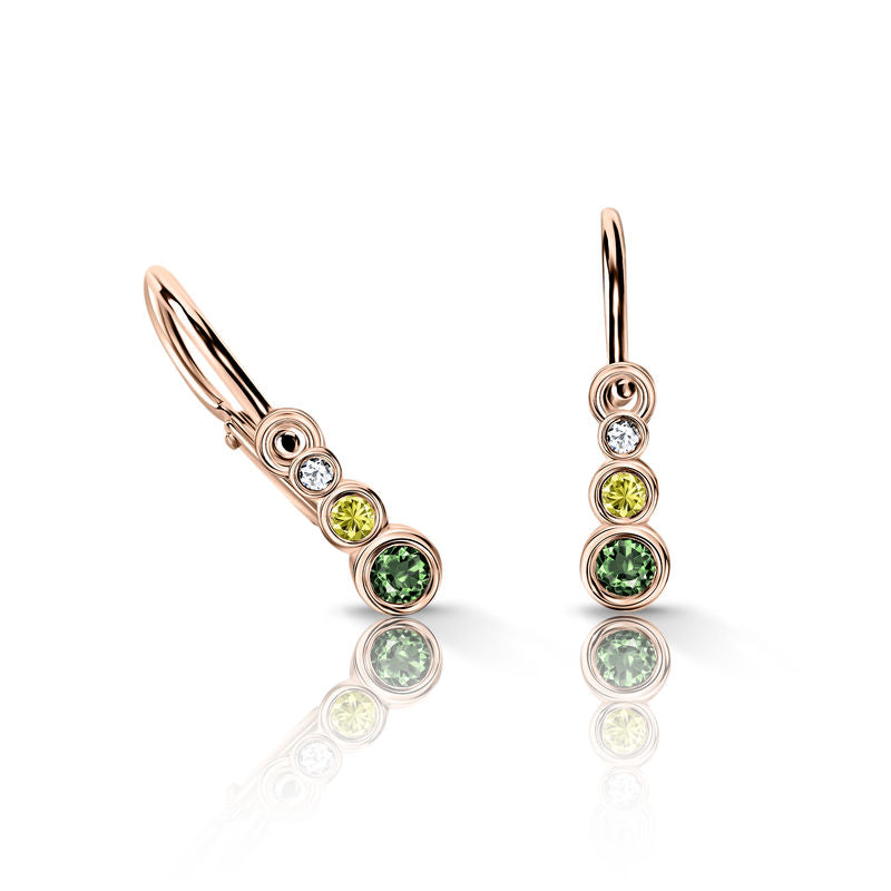 Detské náušnice Danfil C2255 z ružového zlata s tmavozelenými, žltými a bielymi kameňmi, mosadzné zapínanie
