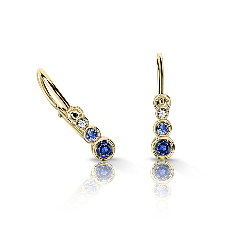 Detské náušnice Danfil C2255 zo žltého zlata s tmavomodrými, svetlomodrými a bielymi kamienkami, brizúrové zapínanie