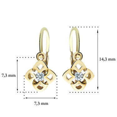 Detské náušničky v tvare klasik so zapínaním typu brizúra sú vyrobené z žltého 14k zlata a osadené tmavo zelenými zirkónmi. Zlaté náušnice majú puncovú značku 585/1000 od štátneho puncového úradu. Tento typ zapínania považujeme za jeden z najbezpečnejších a je najvhodnejší ako prvé náušničky pre bábätko. Všetky rozmery sú podrobne rozkreslené na podpornej fotografii. Ku každým náušničkám je možné vybrať si aj ladiaci prívesok s retiazkou.