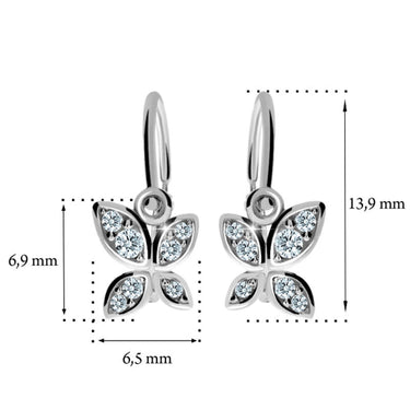 Detské náušničky v tvare motýlika so zapínaním typu brizúra sú vyrobené z bieleho 14k zlata a osadené svetlo ružovými zirkónmi. Zlaté náušnice majú puncovú značku 585/1000 od štátneho puncového úradu. Tento typ zapínania považujeme za jeden z najbezpečnejších a je najvhodnejší ako prvé náušničky pre bábätko. Všetky rozmery sú podrobne rozkreslené na podpornej fotografii. Ku každým náušničkám je možné vybrať si aj ladiaci prívesok s retiazkou.