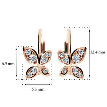 Detské náušničky v tvare motýlika so zapínaním typu klapka sú vyrobené z ružového 14k zlata a osadené svetlo ružovými zirkónmi. Zlaté náušnice majú puncovú značku 585/1000 od štátneho puncového úradu. Tento typ zapínania považujeme za jeden z najbezpečnejších a je najvhodnejší pre malé slečny vo veku od cca 5 rokov. Na tento typ zapínania je možné za príplatok umiestniť bezpečnosťou poistky. Všetky rozmery sú podrobne rozkreslené na podpornej fotografii. Ku každým náušničkám je možné vybrať si aj ladiaci prívesok s retiazkou.