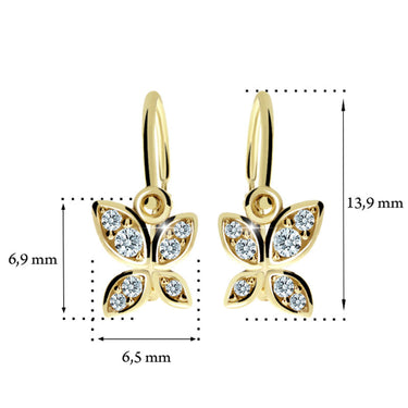 Detské náušničky v tvare motýlika so zapínaním typu brizúra sú vyrobené z žltého 14k zlata a osadené svetlo ružovými zirkónmi. Zlaté náušnice majú puncovú značku 585/1000 od štátneho puncového úradu. Tento typ zapínania považujeme za jeden z najbezpečnejších a je najvhodnejší ako prvé náušničky pre bábätko. Všetky rozmery sú podrobne rozkreslené na podpornej fotografii. Ku každým náušničkám je možné vybrať si aj ladiaci prívesok s retiazkou.