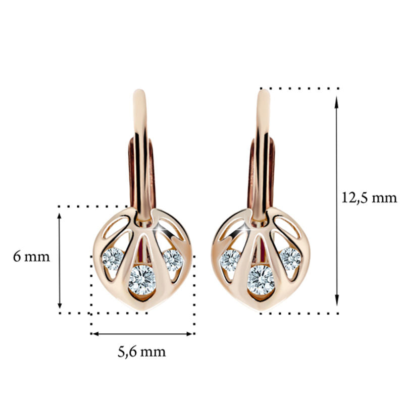 Detské náušničky v tvare klasik so zapínaním typu klapka sú vyrobené z ružového 14k zlata a osadené bielymi zirkónmi. Zlaté náušnice majú puncovú značku 585/1000 od štátneho puncového úradu. Tento typ zapínania považujeme za jeden z najbezpečnejších a je najvhodnejší pre malé slečny vo veku od cca 5 rokov. Na tento typ zapínania je možné za príplatok umiestniť bezpečnosťou poistky. Všetky rozmery sú podrobne rozkreslené na podpornej fotografii. Ku každým náušničkám je možné vybrať si aj ladiaci prívesok s retiazkou.