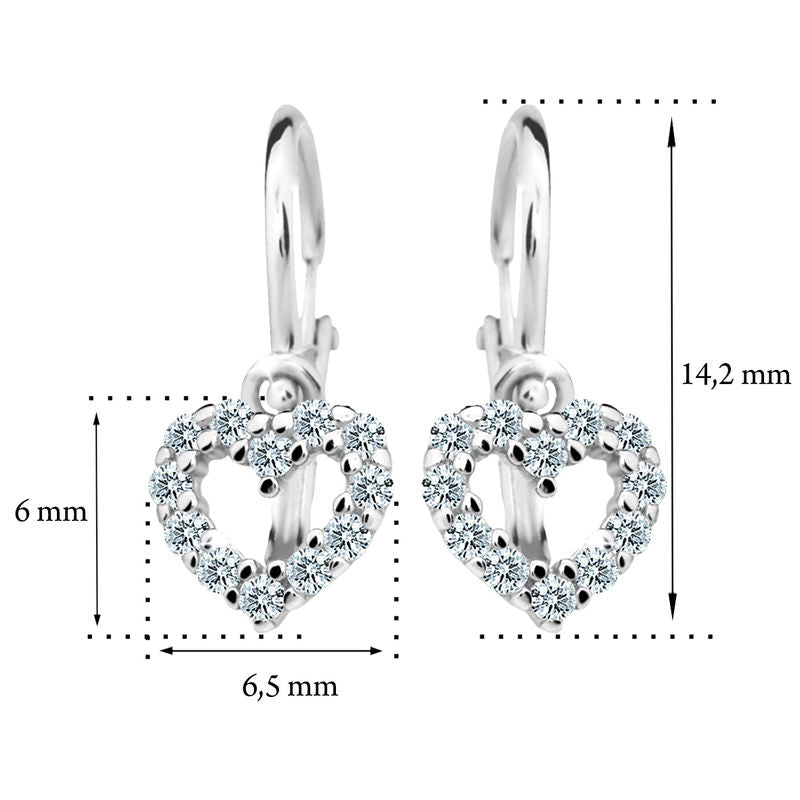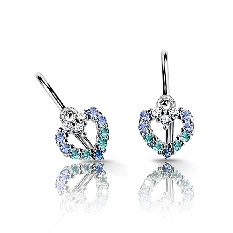 Detské náušnice Danfil hearts C2157 z bieleho zlata s tmavomodrými, mentolovými, svetlomodrými a bielymi zirkónmi, mosadzné zapínanie