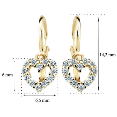 Detské náušnice Danfil hearts C2157 zo žltého zlata s červenými, malinovými, ružovými a bielymi zirkónmi, mosadzné zapínanie