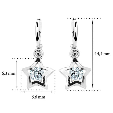 Detské náušničky v tvare hviezdičky so zapínaním typu brizúra sú vyrobené z bieleho 14k zlata a osadené svetlo zelenými zirkónmi. Zlaté náušnice majú puncovú značku 585/1000 od štátneho puncového úradu. Tento typ zapínania považujeme za jeden z najbezpečnejších a je najvhodnejší ako prvé náušničky pre bábätko. Všetky rozmery sú podrobne rozkreslené na podpornej fotografii. Ku každým náušničkám je možné vybrať si aj ladiaci prívesok s retiazkou.