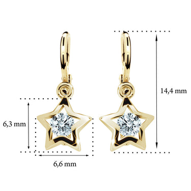 Detské náušničky v tvare hviezdičky so zapínaním typu brizúra sú vyrobené z žltého 14k zlata a osadené svetlo zelenými kamienkami. Zlaté náušnice majú puncovú značku 585/1000 od štátneho puncového úradu. Tento typ zapínania považujeme za jeden z najbezpečnejších a je najvhodnejší ako prvé náušničky pre bábätko. Všetky rozmery sú podrobne rozkreslené na podpornej fotografii. Ku každým náušničkám je možné vybrať si aj ladiaci prívesok s retiazkou.