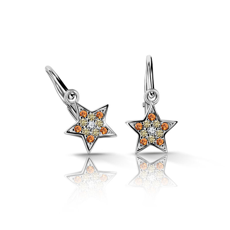 Detské náušnice Danfil hviezdičky C2228 z bieleho zlata s oranžovými, žltými a bielymi zirkónmi, brizúrové zapínanie