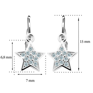Detské náušnice v tvare hviezdy s mosadzným zapínaním sú vyrobené zo 14-karátového zlata a osadené dúhovými zirkónmi. Zlaté náušnice sú označené štátnou puncovou značkou 585/1000. Tento typ zapínania považujeme za jeden z najbezpečnejších a najvhodnejších ako prvé náušnice pre dieťa. Všetky rozmery sú podrobne uvedené na spodnej fotografii. Ku každej náušnici je možné vybrať vhodný prívesok na retiazku.