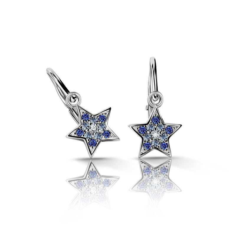 Detské náušnice Danfil hviezdičky C2228 z bieleho zlata s tmavomodrými, svetlomodrými a bielymi zirkónmi, mosadzné zapínanie