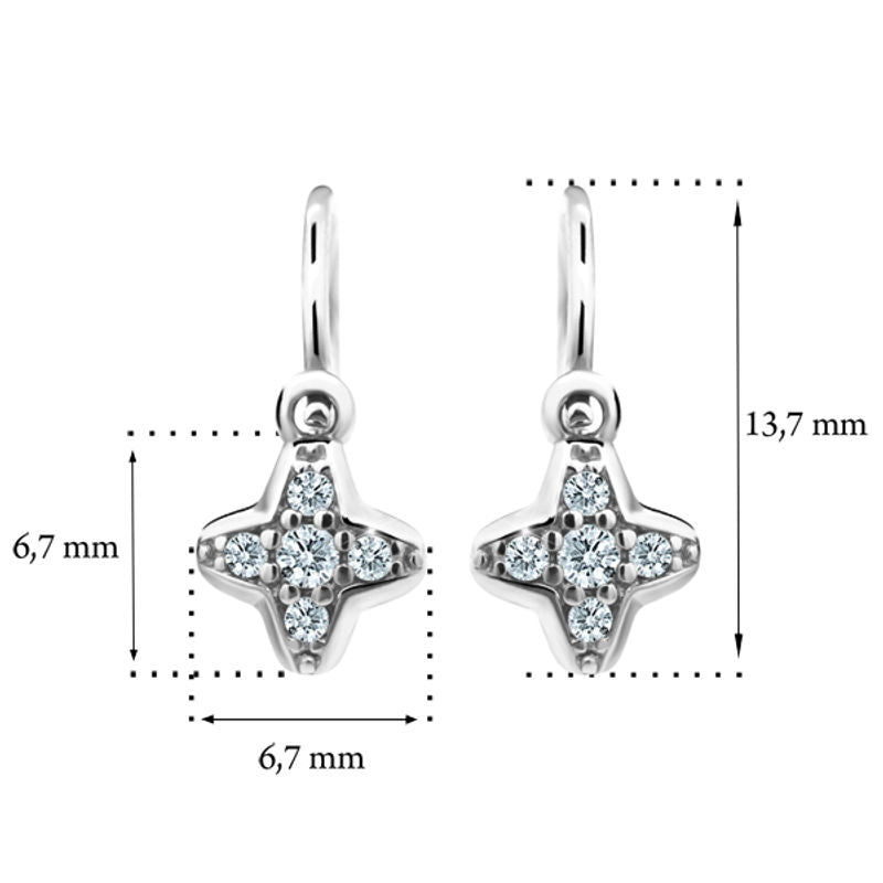 Detské náušničky v tvare hviezdičky so zapínaním typu brizúra sú vyrobené z bieleho 14k zlata a osadené svetlo ružovými kamienkami. Zlaté náušnice majú puncovú značku 585/1000 od štátneho puncového úradu. Tento typ zapínania považujeme za jeden z najbezpečnejších a je najvhodnejší ako prvé náušničky pre bábätko. Všetky rozmery sú podrobne rozkreslené na podpornej fotografii. Ku každým náušničkám je možné vybrať si aj ladiaci prívesok s retiazkou.