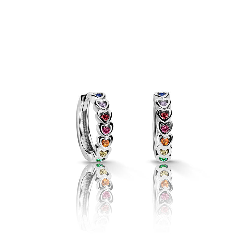Dětské náušnice kroužky ze 14k zlata jsou tvořeny řadou srdíček se střídajícími se duhovými barvami zirkonů. Zlaté náušnice jsou opatřeny puncovní značkou 585/1000 od státního puncovního úřadu. Tento typ zapínání je velice pohodlný na nošení a je vhodný pro holčičky ve věku zhruba do 6 let. Veškeré rozměry jsou podrobně rozkresleny v podpurné fotografii.
