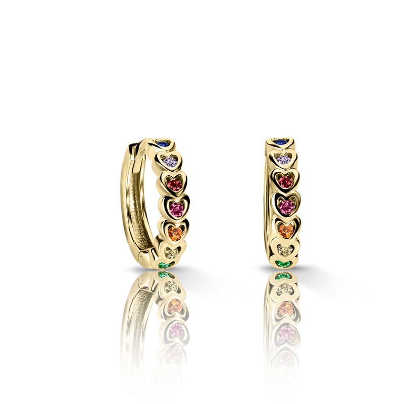 Dětské náušnice kroužky ze 14k zlata jsou tvořeny řadou srdíček se střídajícími se duhovými barvami zirkonů. Zlaté náušnice jsou opatřeny puncovní značkou 585/1000 od státního puncovního úřadu. Tento typ zapínání je velice pohodlný na nošení a je vhodný pro holčičky zhruba ve věku od 6 let. Veškeré rozměry jsou podrobně rozkresleny v podpurné fotografii.