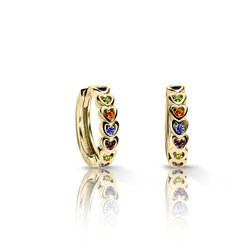 Dětské náušnice kroužky ze 14k zlata jsou tvořeny řadou srdíček se střídajícími se duhovými barvami zirkonů. Zlaté náušnice jsou opatřeny puncovní značkou 585/1000 od státního puncovního úřadu. Tento typ zapínání je velice pohodlný na nošení a je vhodný pro holčičky zhruba ve věku od 6 let. Veškeré rozměry jsou podrobně rozkresleny v podpurné fotografii.