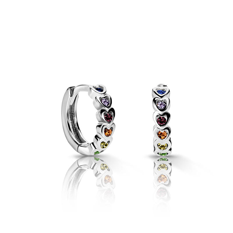 Detské náušnice krúžky zo 14 karátového zlata sú tvorené radom srdiečok so striedajúcimi sa dúhovými farebnými zirkónmi. Zlaté náušnice sú označené štátnou puncovou značkou 585/1000. Tento typ zapínania je veľmi pohodlný na nosenie a je vhodný pre malé dievčatká vo veku približne 3 rokov. Všetky rozmery sú podrobne uvedené na spodnej fotografii.