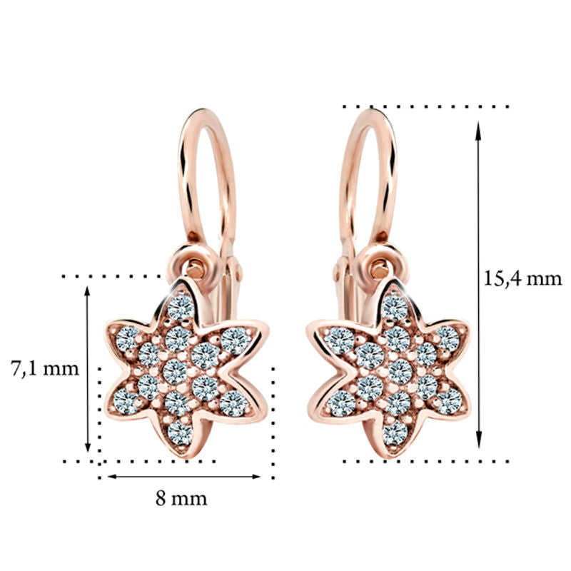 Detské náušničky v tvare kvetinky so zapínaním typu brizúra sú vyrobené z ružového 14k zlata a osadené fialovými zirkónmi. Zlaté náušnice majú puncovú značku 585/1000 od štátneho puncového úradu. Tento typ zapínania považujeme za jeden z najbezpečnejších a je najvhodnejší ako prvé náušničky pre bábätko. Všetky rozmery sú podrobne rozkreslené na podpornej fotografii. Ku každým náušničkám je možné vybrať si aj ladiaci prívesok s retiazkou.