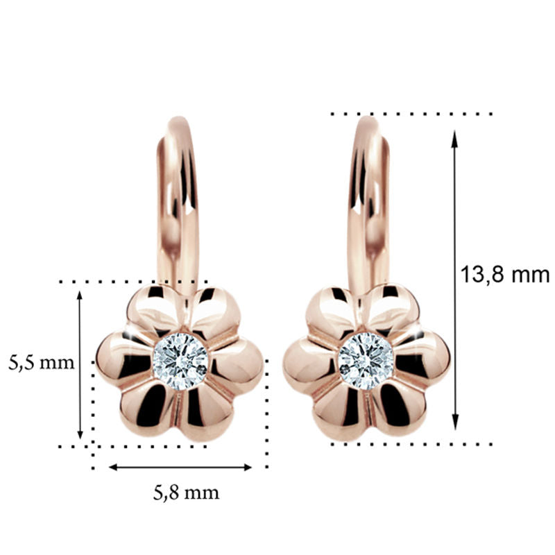 Detské náušničky v tvare kvetinky so zapínaním typu klapka sú vyrobené z ružového 14k zlata a osadené bielymi kamienkami. Zlaté náušnice majú puncovú značku 585/1000 od štátneho puncového úradu. Tento typ zapínania považujeme za jeden z najbezpečnejších a je najvhodnejší pre malé slečny vo veku od cca 5 rokov. Na tento typ zapínania je možné za príplatok umiestniť bezpečnosťou poistky. Všetky rozmery sú podrobne rozkreslené na podpornej fotografii. Ku každým náušničkám je možné vybrať si aj ladiaci prívesok s retiazkou.