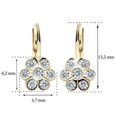 Detské náušničky v tvare kvetinky so zapínaním typu klapka sú vyrobené z žltého 14k zlata a osadené oranžovými zirkónmi. Zlaté náušnice majú puncovú značku 585/1000 od štátneho puncového úradu. Tento typ zapínania považujeme za jeden z najbezpečnejších a je najvhodnejší pre malé slečny vo veku od cca 5 rokov. Na tento typ zapínania je možné za príplatok umiestniť bezpečnosťou poistky. Všetky rozmery sú podrobne rozkreslené na podpornej fotografii. Ku každým náušničkám je možné vybrať si aj ladiaci prívesok s retiazkou.