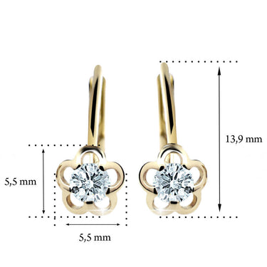 Detské náušničky v tvare kvetinky so zapínaním typu klapka sú vyrobené z žltého 14k zlata a osadené červenými kamienkami. Zlaté náušnice majú puncovú značku 585/1000 od štátneho puncového úradu. Tento typ zapínania považujeme za jeden z najbezpečnejších a je najvhodnejší pre malé slečny vo veku od cca 5 rokov. Na tento typ zapínania je možné za príplatok umiestniť bezpečnosťou poistky. Všetky rozmery sú podrobne rozkreslené na podpornej fotografii. Ku každým náušničkám je možné vybrať si aj ladiaci prívesok s retiazkou.