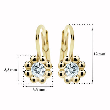 Detské náušničky v tvare kvetinky so zapínaním typu klapka sú vyrobené z žltého 14k zlata a osadené bielymi kamienkami. Zlaté náušnice majú puncovú značku 585/1000 od štátneho puncového úradu. Tento typ zapínania považujeme za jeden z najbezpečnejších a je najvhodnejší pre malé slečny vo veku od cca 5 rokov. Na tento typ zapínania je možné za príplatok umiestniť bezpečnosťou poistky. Všetky rozmery sú podrobne rozkreslené na podpornej fotografii. Ku každým náušničkám je možné vybrať si aj ladiaci prívesok s retiazkou.