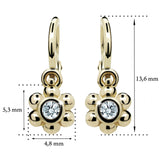 Detské náušničky v tvare kvetinky so zapínaním typu brizúra sú vyrobené z žltého 14k zlata a osadené červenými kamienkami. Tento typ zapínania považujeme za jeden z najbezpečnejších a je najvhodnejší ako prvé náušničky pre bábätko. Všetky rozmery sú podrobne rozkreslené na podpornej fotografii. Ku každým náušničkám je možné vybrať si aj ladiaci prívesok s retiazkou.