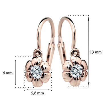 Detské náušničky v tvare kvetinky so zapínaním typu brizúra sú vyrobené z ružového 14k zlata a osadené bielymi kamienkami. Zlaté náušnice majú puncovú značku 585/1000 od štátneho puncového úradu. Tento typ zapínania považujeme za jeden z najbezpečnejších a je najvhodnejší ako prvé náušničky pre bábätko. Všetky rozmery sú podrobne rozkreslené na podpornej fotografii. Ku každým náušničkám je možné vybrať si aj ladiaci prívesok s retiazkou.