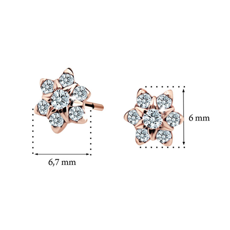 Detské náušničky v tvare kvetinky so zapínaním typu puzeta sú vyrobené z ružového 14k zlata a osadené červenými zirkónmi. Tento typ zapínania považujeme za jeden z najbezpečnejších a je najvhodnejší pre dievčatká od 6 mesiacov. Všetky rozmery sú podrobne rozkreslené na podpornej fotografii. Ku každým náušničkám je možné vybrať si aj ladiaci prívesok s retiazkou.