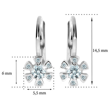 Detské náušničky v tvare kvetinky so zapínaním typu klapka sú vyrobené z bieleho 14k zlata a osadené bielymi kamienkami. Zlaté náušnice majú puncovú značku 585/1000 od štátneho puncového úradu. Tento typ zapínania považujeme za jeden z najbezpečnejších a je najvhodnejší pre malé slečny vo veku od cca 5 rokov. Na tento typ zapínania je možné za príplatok umiestniť bezpečnosťou poistky. Všetky rozmery sú podrobne rozkreslené na podpornej fotografii. Ku každým náušničkám je možné vybrať si aj ladiaci prívesok s retiazkou.