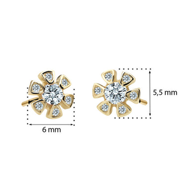 Detské náušničky v tvare kvetinky so zapínaním typu balónik sú vyrobené z žltého 14k zlata a osadené svetlo ružovými zirkónmi. Zapínanie je vhodné až od 6 mesiacov. Všetky rozmery sú podrobne rozkreslené na podpornej fotografii. Ku každým náušničkám je možné vybrať si aj ladiaci prívesok s retiazkou.
