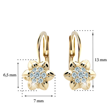 Detské náušničky v tvare kvetinky so zapínaním typu klapka sú vyrobené z žltého 14k zlata a osadené bielymi kamienkami. Zlaté náušnice majú puncovú značku 585/1000 od štátneho puncového úradu. Tento typ zapínania považujeme za jeden z najbezpečnejších a je najvhodnejší pre malé slečny vo veku od cca 5 rokov. Na tento typ zapínania je možné za príplatok umiestniť bezpečnosťou poistky. Všetky rozmery sú podrobne rozkreslené na podpornej fotografii. Ku každým náušničkám je možné vybrať si aj ladiaci prívesok s retiazkou.