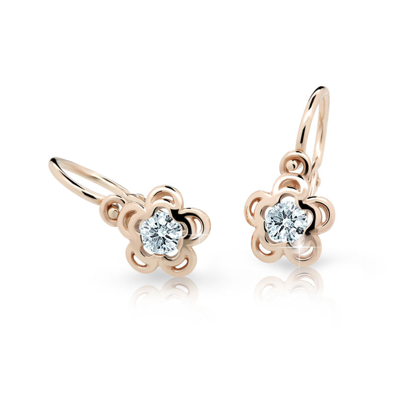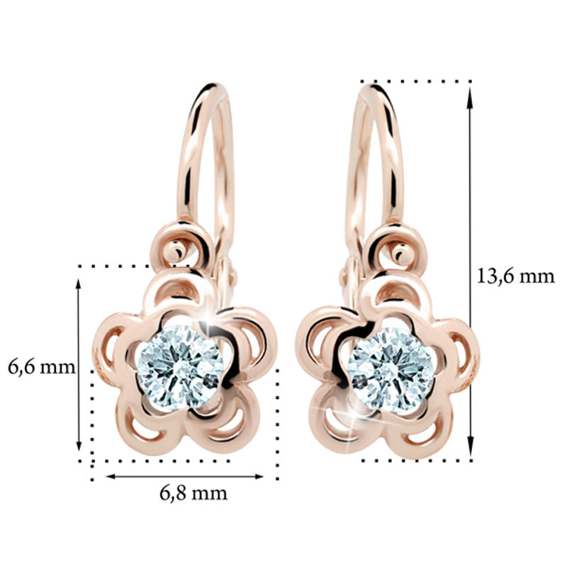 Detské náušničky v tvare kvetinky so zapínaním typu brizúra sú vyrobené z ružového 14k zlata a osadené bielymi zirkónmi. Zlaté náušnice majú puncovú značku 585/1000 od štátneho puncového úradu. Tento typ zapínania považujeme za jeden z najbezpečnejších a je najvhodnejší ako prvé náušničky pre bábätko. Všetky rozmery sú podrobne rozkreslené na podpornej fotografii. Ku každým náušničkám je možné vybrať si aj ladiaci prívesok s retiazkou.