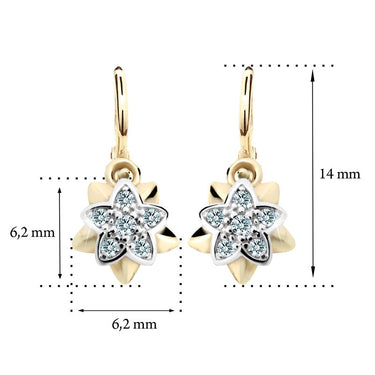 Detské náušničky v tvare kvetinky so zapínaním typu brizúra sú vyrobené z žltého 14k zlata a osadené svetlo zelenými zirkónmi. Zlaté náušnice majú puncovú značku 585/1000 od štátneho puncového úradu. Tento typ zapínania považujeme za jeden z najbezpečnejších a je najvhodnejší ako prvé náušničky pre bábätko. Všetky rozmery sú podrobne rozkreslené na podpornej fotografii. Ku každým náušničkám je možné vybrať si aj ladiaci prívesok s retiazkou.
